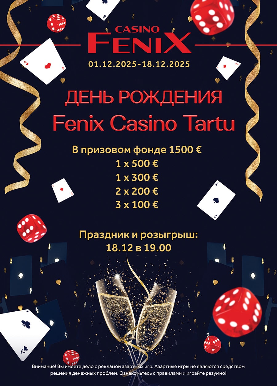 - Игровой зал Tartu Fenix Casino примет участие в дополнительной азартной игре «День рождения игрового зала Tartu».