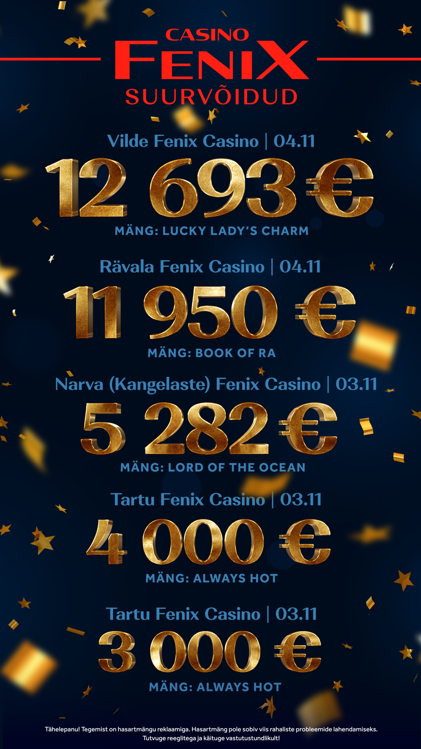 Rakvere Fenix Casino on alates 31.10.2025 kell 23.00 uuendustööde tõttu ajutiselt suletud. Uuenenud Rakvere mängusaali avame detsembri alguses. Vabandame ebamugavuste pärast!
