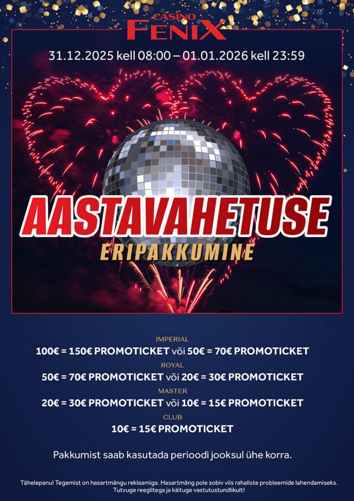 Pakkumine ajavahemikul 24.12.2025 (kell 08:00) – 26.12.2025 (kell 23:59) kehtib kõigis Fenix Casino mängusaalides igale Club Fenix klubikaardi omanikule eripakkumine: