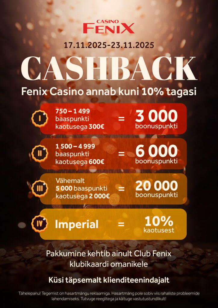 17.-23. novembril toimub Fenix Casino mängusaalides Cashback, mille raames anname Sulle tagasi kuni 10%!