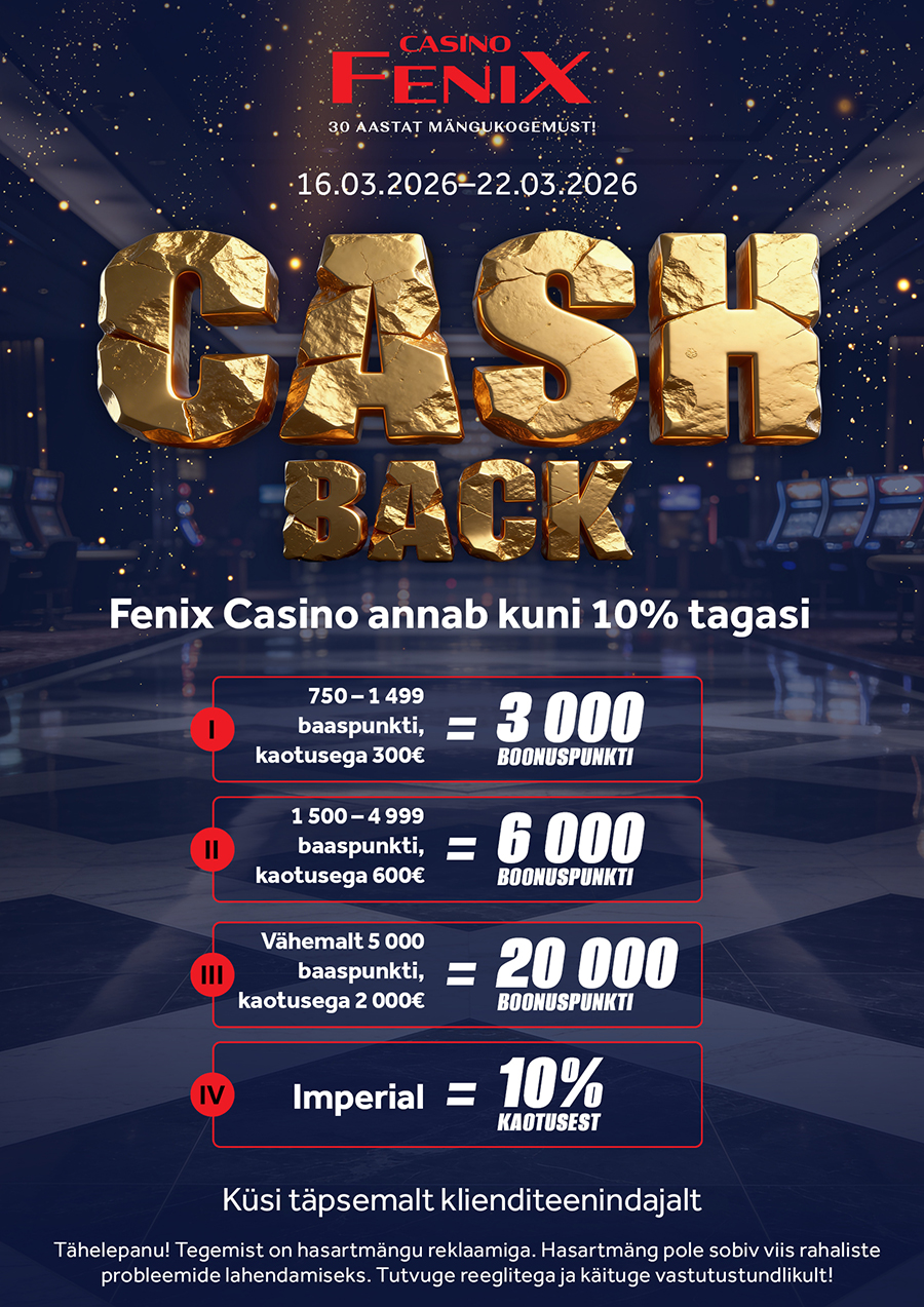 16.-22. märtsil toimub Fenix Casino mängusaalides Cashback, mille raames anname Sulle tagasi kuni 10%!