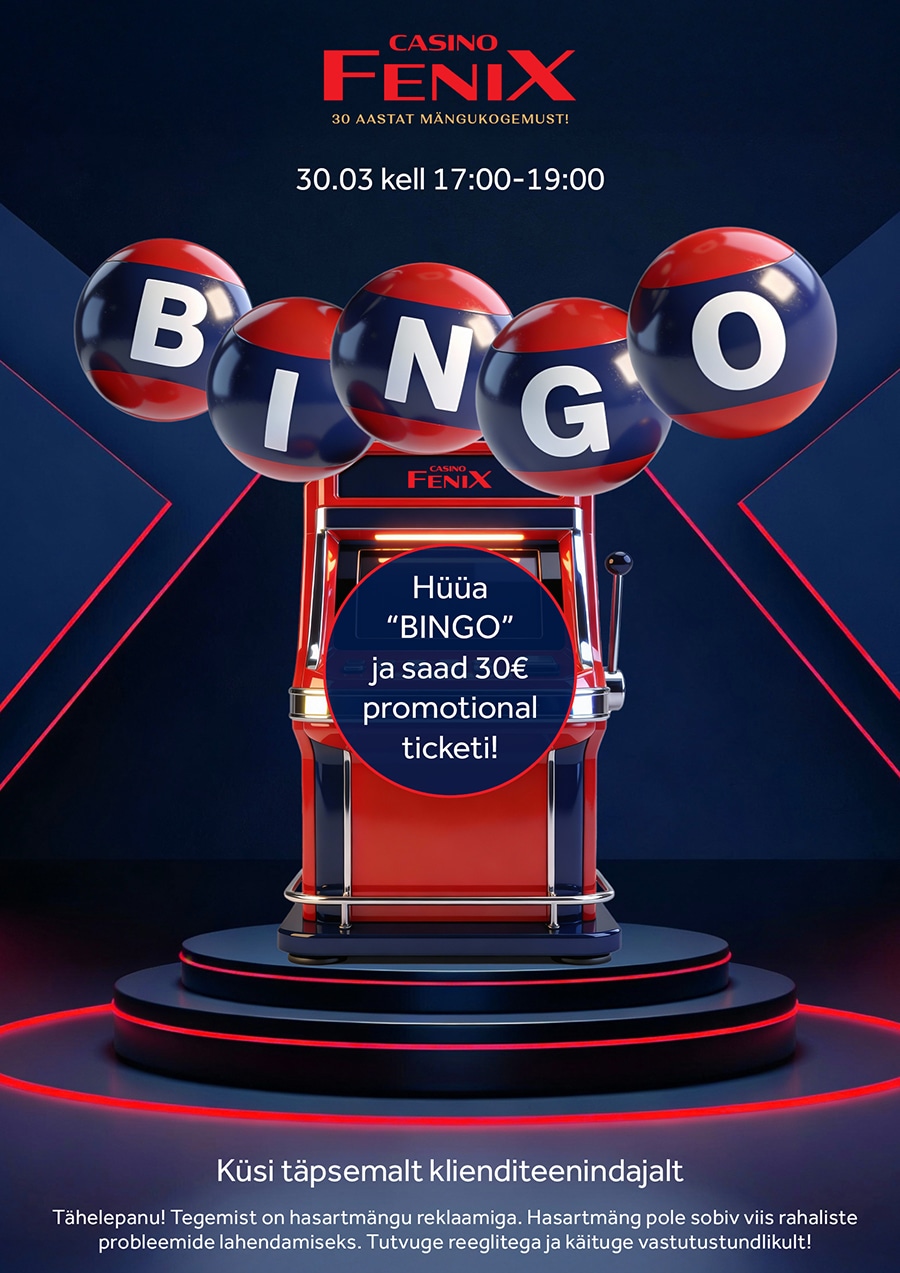 Fenix Casino BINGO 30.03 kell 17:00-19:00 igas Fenix Casino mängusaalis.
