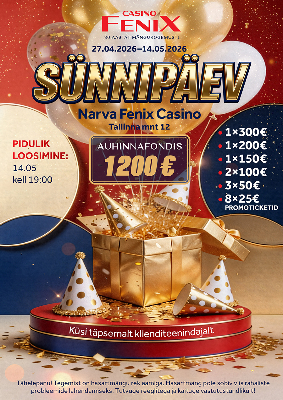 • Loosimine toimub 14.05.2026 Narva (Tallinna mnt 12) Fenix Casinos pärast sünnipäevakampaania loosimise lõppu.