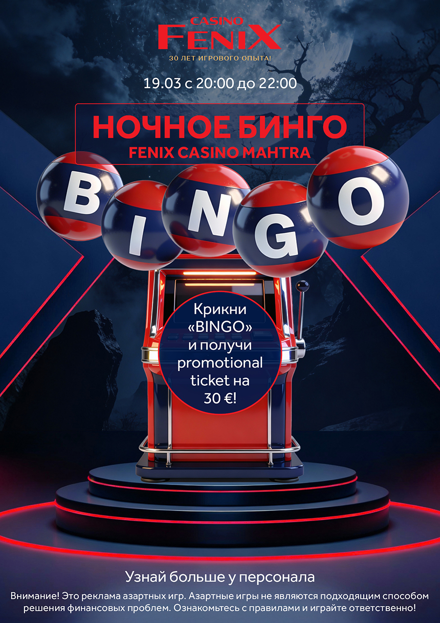 В этот четверг 19.03 в 20:00-22:00 в игровом зале казино Mahtra Fenix состоится НОЧНОЕ БИНГО для всех владельцев клубных карт Club Fenix.