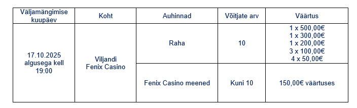 - Auhindade väljamängimine toimub Viljandi Fenix Casino mängusaalis.